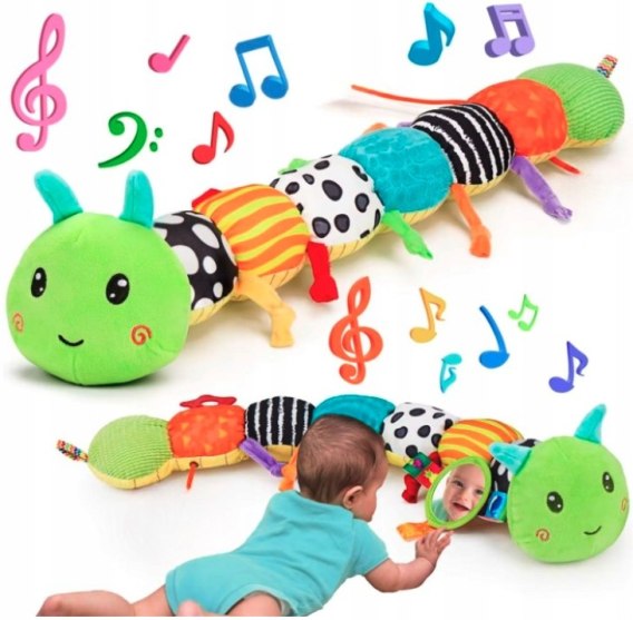 GĄSIENICA PLUSZOWA SENSORYCZNA DLA NIEMOWLĄT Z MUZYKĄ ANTYSTRESOWA LUSTERKO