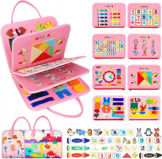 TABLICA Manipulacyjna Sensoryczna MONTESSORI Zegar Walizka Materiałowa 8w1